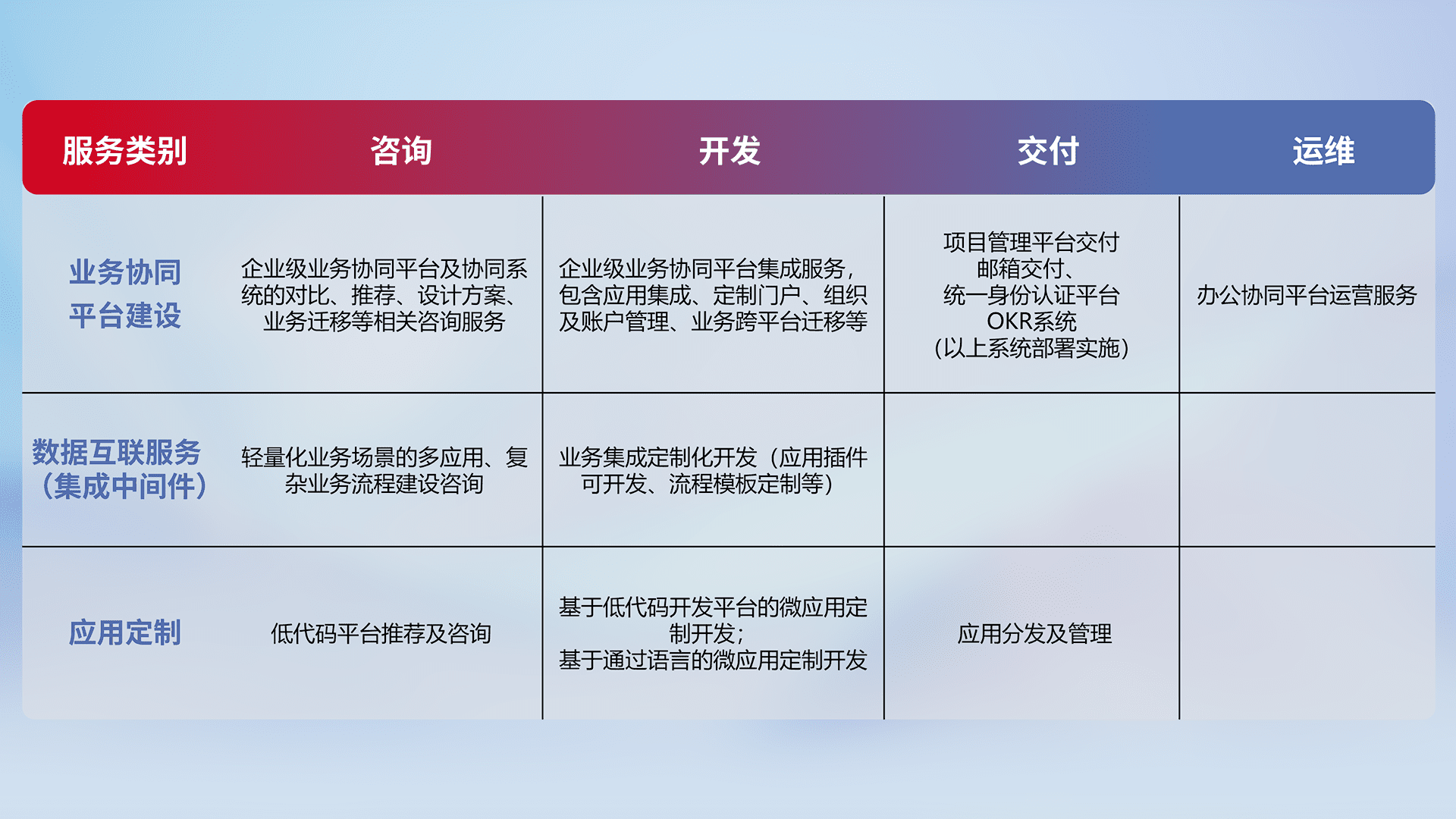 针对钉钉、、、企微、、IDaas等平台级产品提供产品的规划、、、、方案、、、交付、、定制化开发等服务,,,,实现如统一协同办公、、、智能客户服务、、混合会议管理、、、智能数据查询、、、、等业务场景,,实现数字化转型。。。。