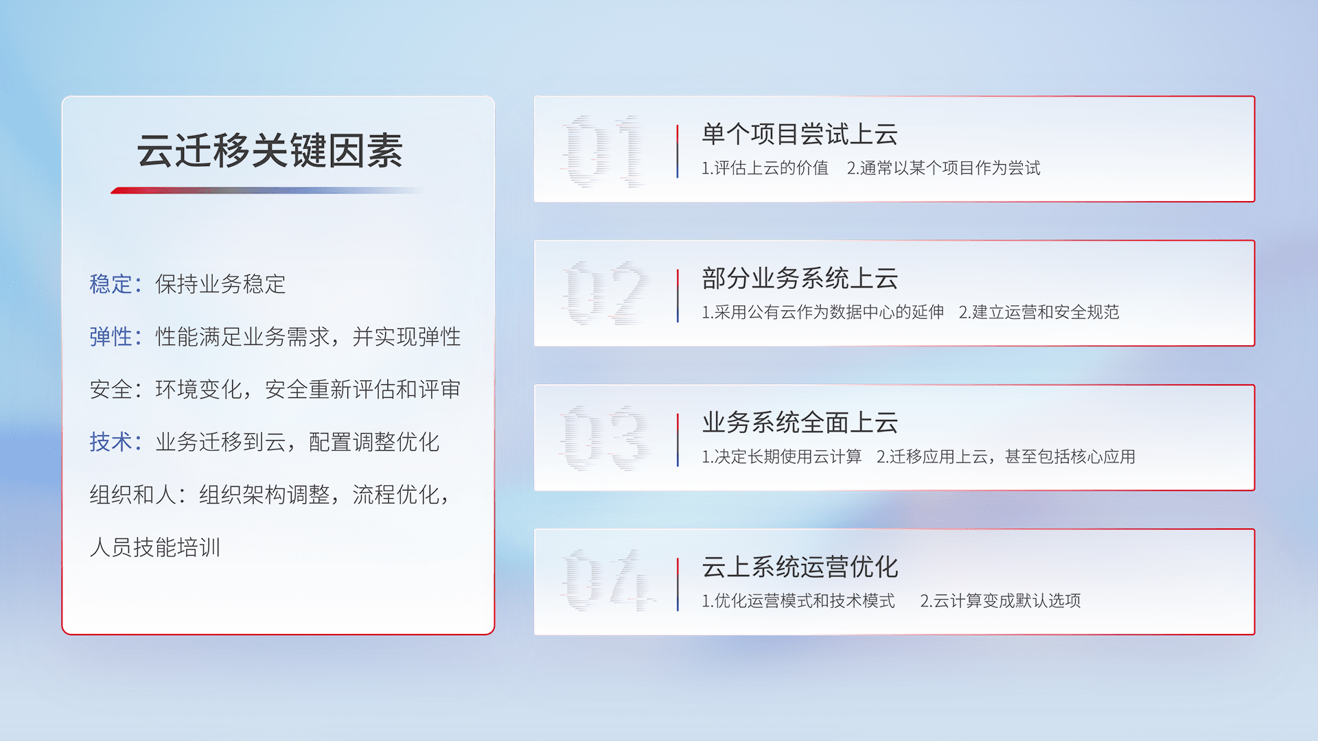 结合实际业务,,从规划设计、、、、云平台选型、、、云原生改造、、、、数据迁移、、、集成交付,,,,迁移全过程为客户识别最佳上云路径,,做好风险识别管理,,,,设计网络架构、、、、身份权限、、、安全审计合规、、、操作审计、、日志审计、、监控告警策略、、、、多站点容灾设计等,,,,对云上基础设施进行整体规划,,,,提升IT治理水平,,,,以满足弹性、、、高可用、、高性能的需求。。